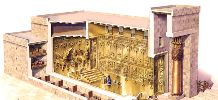 وقد كان هذا المبنى مستطيلاً متواضعاً في أبعاده، لأنه لم يخصّص، ليضمّ جمهور المصلّين، ووفقاً لما هو معتاد في تلك الفترة، كان الجمهور يجتمع أمام الهيكل وليس في وسطه؛ وينقسم الهيكل إلى ثلاثة أجزاء؛ حجرة التجمّع (قاعة) وقاعة “الهيكل” وقدس الأقداس، وهو عبارة عن حجرة مظلمة بدون نوافذ، وفيه كان يوضع “تابوت العهد” واثنان من “الكروبيم” (الملائكة المجنّحة) من خشب مكسوّ بالذهب يظلّلان عليه من كلا الجانبين.