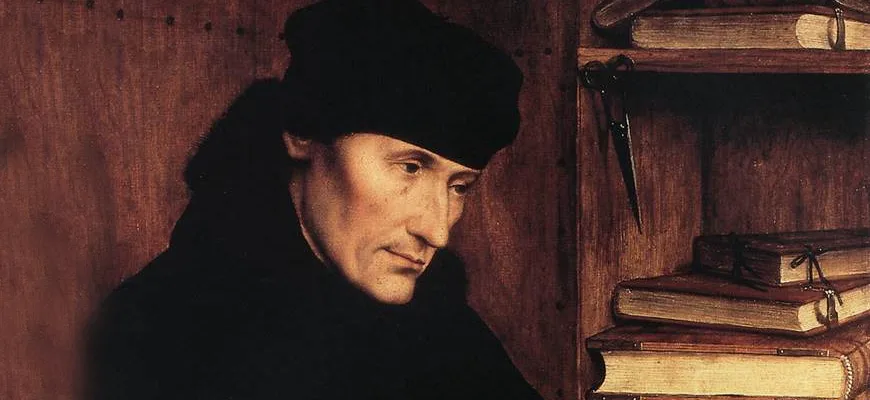 ولد الفيلسوف الهولندي إرازموس في روتردام في 28 أكتوبر 1466. ترهّب في دير شتاين (Steyen) الأوغسطيني وعبثا حاول إقناع نفسه بحياة الدير في مقال له بعنوان “تأمّلات في الوجود” فطلب إعفاءه من رتبة الكهنوت واستجاب له البابا فحلّه من نذره، وانطلق عالما مستقلاّ يجول في أنحاء أوروبا وخاصة فرنسا وأنجلترا. التحق بجامعة السوربون بباريس ولكنّ الفكر الفلسفي السائد فيها لم يرق له، فقصد لندن حيث التقى أشهر علمائها ومنهم توماس مور (Thomas More) وجيمس فيشر (James Fisher) وجون كوليت (John Colet) مؤسّس مدرسة القديس بولس مهد انبعاث الحركة الإنسانيّة بالمدارس الانجليزيّة. انكبّ على دراسة الكتب المقدّسة وتعلّم اللغة اليونانيّة لذلك الغرض، وكان أوّل من درّسها في جامعة كمبردج، كما تعلّم اللغة العبريّة. حصل على درجة الدكتوراه من جامعة تورينو الإيطاليّة عام 1506 فذاع صيته ومنحته الكنيسة لقب “علاّمة”.